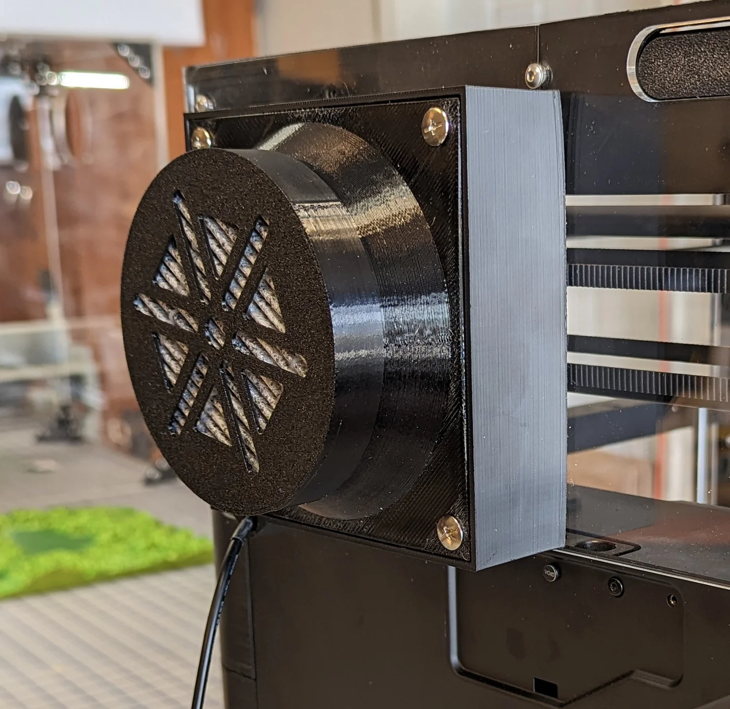 The USB interface is plug and play so if you have a different printer or a different enclosure, our filter will work great. With a different enclosure you the filter can simply be set inside to recirculate and continuously clean the air. Or, If you wish to mount your filter, you can simply set up mounting holes spaced at 105mm apart in a square pattern.